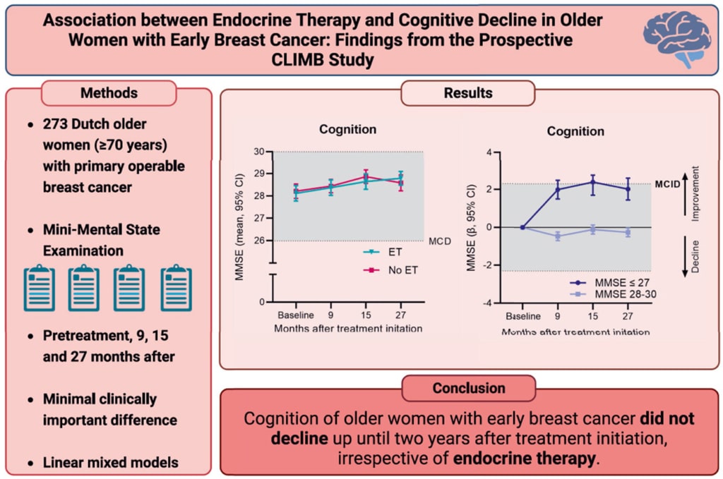 CLIMB is a longitudinal cohort study that investigated patient-reported outcomes, such as cognitive functioning, in older women (aged ≥70 years) with early breast cancer during the first two years following treatment initiation. One of the aims of the CLIMB was to assess cognitive functioning during endocrine therapy and to identify subgroups that might be susceptible to accelerated cognitive decline.